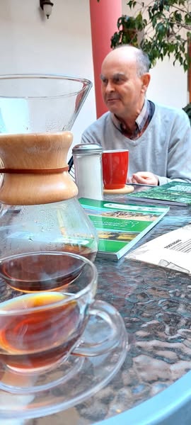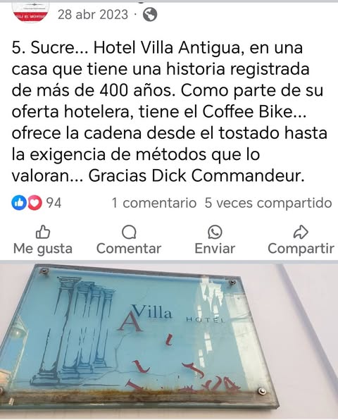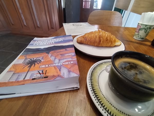 Coffee Bike… estuve aquí exactamente hace 2 años, la foto de Dick Commandeur fue entonces. Y hoy, hospedado en Hotel Villa Antigua, converso con su libro «Crónica de la Independencia de Bolivia», y un café que no tiene tiempo.